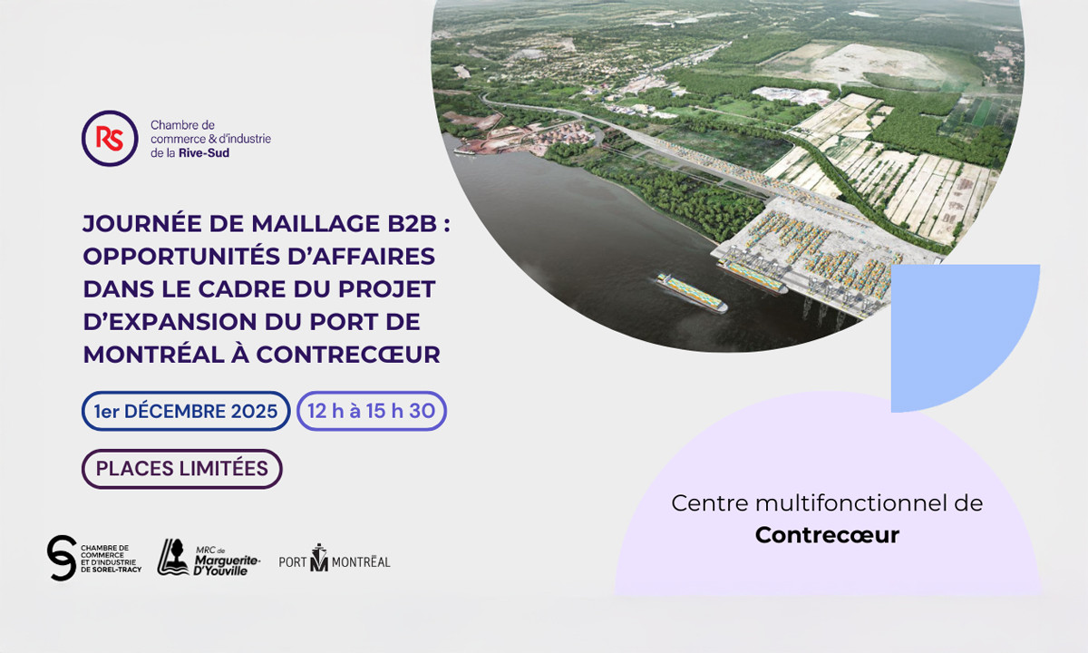 Le Service de développement économique (SDE) de la MRC de Marguerite-D’Youville invite les entreprises du territoire à participer à une importante journée de maillage B2B, le lundi 1er décembre 2025, de 12 h à 15 h 30, au Centre multifonctionnel de Contrecœur, organisée en collaboration avec la Chambre de commerce et d’industrie de la Rive-Sud (CCIRS), le Port de Montréal et la Chambre de commerce et d’industrie de Sorel-Tracy.