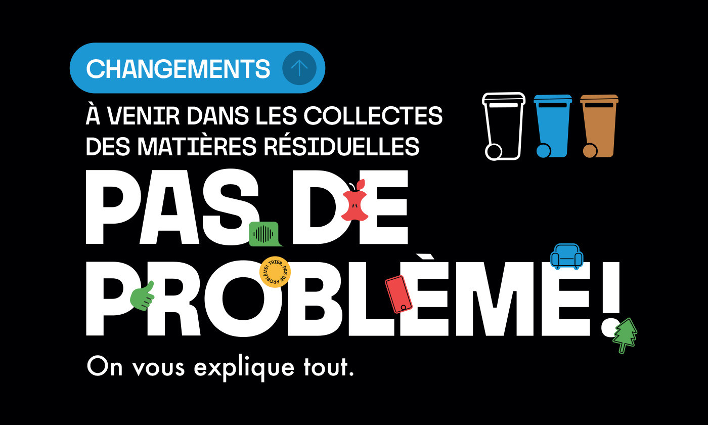 À partir de janvier 2026, la MRC adoptera de nouvelles façons de faire pour mieux gérer les matières résiduelles sur son territoire. Sous le thème « Pas de problème! », ces changements permettront d’améliorer le tri, de diminuer l’enfouissement et d'optimiser les coûts, tout en contribuant à un environnement plus sain.